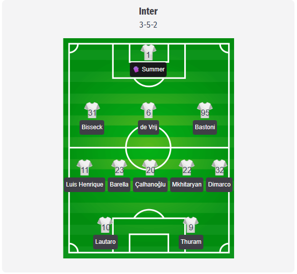 Η Ίντερ αναμένεται να ξεκινήσει με σύστημα 3-5-2. Λόγω των προβλημάτων στον αστράγαλο του Ντουμφρις, ο Κριστιάν Τσίβου θα πρέπει να αυτοσχεδιάσει στη δεξιά πλευρά της άμυνας, ενώ πιθανότατα ο Λουίς Ενρίκε θα αναλάβει τη θέση του εξτρέμ. Στην τριάδα της άμυνας, οι Μπισέκ, Ντε Βρι και Μπαστόνι θα πρέπει να εξασφαλίσουν σταθερότητα, ενώ ο Ντιμάρκο θα αναλάβει την αριστερή πλευρά. Στο κέντρο αναμένεται να αγωνιστεί το τρίο Barella, Çalhanoğlu και Mkhitaryan, ο οποίος είναι και πάλι διαθέσιμος μετά τον τραυματισμό του και φέρνει μεγάλη εμπειρία. Στην επίθεση αναμένεται να ξεκινήσει το δίδυμο Lautaro Martínez και Marcus Thuram. Σημείωση: πρόκειται για πρόβλεψη, η τελική σύνθεση θα ανακοινωθεί από τον Chivu λίγο πριν την έναρξη του αγώνα.
