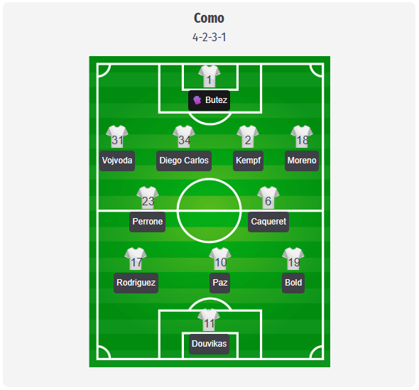 Ο προπονητής Cesc Fàbregas αναμένεται να παρατάξει την Κόμο με το δοκιμασμένο σύστημα 4-2-3-1, με τον Butez στο τέρμα. Η άμυνα αποτελείται από τετράδα με τους Vojvoda, Diego Carlos, Kempf και Moreno. Στο κεντρικό μέσο αναμένεται να αγωνιστεί το δίδυμο Perrone και Caqueret. Στην επιθετική τριάδα θα αγωνιστούν οι Rodriguez, Paz και Kühn πίσω από τον επιθετικό Douvikas. Η κατάσταση παραμένει τεταμένη όσον αφορά τις απουσίες, με τον Dossena να λείπει για μεγάλο διάστημα λόγω ρήξης χιαστού συνδέσμου και τον εξτρέμ Diao, με αγοραία αξία περίπου 30 εκατ. ευρώ, να είναι εκτός λόγω τραυματισμού στο μηρό. Σημείωση: αυτή η σύνθεση είναι πρόβλεψη και πρέπει να επιβεβαιωθεί τελικά.
