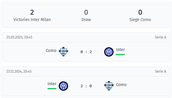 Οι δύο πιο πρόσφατες αναμετρήσεις μεταξύ της Ίντερ και της Κόμο έληξαν με 2-0 για την Ίντερ, τον Δεκέμβριο του 2024 εντός έδρας και τον Μάιο του 2025 εκτός έδρας. Και στις δύο αναμετρήσεις, όλα τα γκολ σημειώθηκαν στο δεύτερο ημίχρονο, ενώ στο ημίχρονο υπήρχαν μόνο λίγες αξιοσημείωτες φάσεις. Η Ίντερ αύξησε σημαντικά την πίεση μετά την αλλαγή των ημιχρόνων και παρέμεινε ταυτόχρονα σταθερή αμυντικά, ενώ η Κόμο δεν κατάφερε να σκοράρει σε καμία από αυτές τις αναμετρήσεις. Συνολικά, σε αυτά τα δύο παιχνίδια σημειώθηκαν μόνο τέσσερα γκολ, και οι δύο αναμετρήσεις έμειναν σαφώς κάτω από 2,5 γκολ, γεγονός που υπογραμμίζει σαφώς την κυριαρχία της Ίντερ και την έλλειψη γκολ της Κόμο σε αυτή τη σειρά.