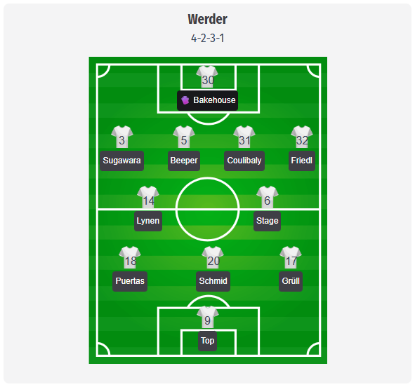 Η Βέρντερ αναμένεται να αγωνιστεί με το συνηθισμένο 4-2-3-1, με τον Backhaus στο τέρμα και την τετράδα των Sugawara, Pieper, Coulibaly και Friedl. Στο κέντρο, οι Lynen και Stage θα σχηματίσουν το δίδυμο των μέσων, με την Stage να προωθείται από το κέντρο προς τα εμπρός και να παραμένει η πιο επικίνδυνη παίκτρια της ομάδας στο πρωτάθλημα, ενώ οι Puertas, Schmid και Grüll θα υποστηρίζουν την Topp στην επίθεση. Οι Friedl και Grüll απέχουν από την τιμωρία με μια κίτρινη κάρτα, κάτι που μπορεί να επηρεάσει τον τρόπο με τον οποίο θα παίζουν επιθετικά.
