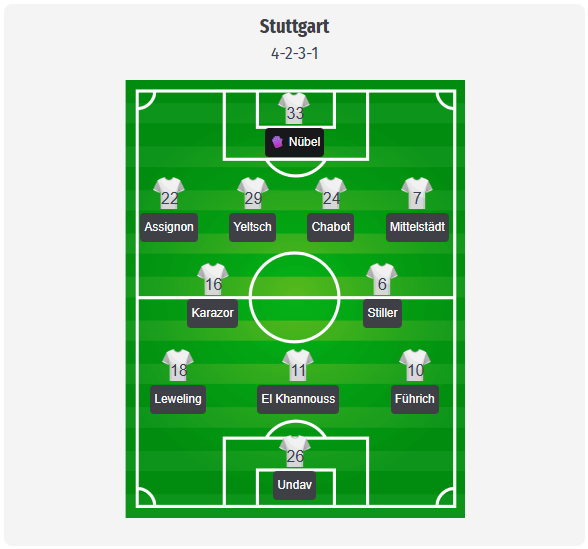 Η Στουτγάρδη υπό τον Hoeneß αναμένεται να διατηρήσει το γνωστό 4-2-3-1, οπότε η προβλεπόμενη σύνθεσή μας προβλέπει τον Nübel στο τέρμα πίσω από μια τετράδα με τους Assignon, Jeltsch, Chabot και Mittelstädt. Οι Karazor και Stiller θα πρέπει να σχηματίσουν το διπλό εξάρι, ενώ οι Leweling, El Khannouss και Führich θα υποστηρίξουν τον Undav, ο οποίος χάρη στην εξαιρετική του φόρμα στο πρωτάθλημα τις τελευταίες εβδομάδες είναι ο σαφής φαβορί για μια θέση στην επίθεση. Πρόκειται για μια προβλεπόμενη ενδεκάδα που δεν έχει ακόμη επιβεβαιωθεί.