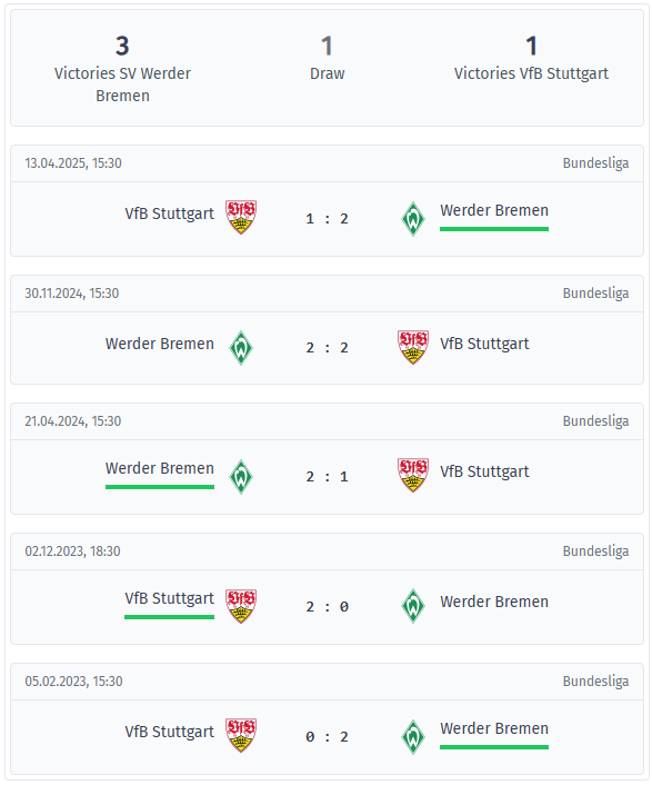 Στις τελευταίες πέντε αναμετρήσεις μεταξύ αυτών των ομάδων, η SV Werder Bremen έχει το πάνω χέρι, με τρεις νίκες, μία ισοπαλία και μία ήττα. Η πιο πρόσφατη αναμέτρηση τον Απρίλιο του 2025 έληξε 2-1 για τη Βρέμη στη Στουτγάρδη και ολοκλήρωσε μια σειρά που από τις αρχές του 2024 έχει αποφέρει στη Βρέμη επτά από τους εννέα πιθανούς βαθμούς σε αυτό το ντέρμπι.