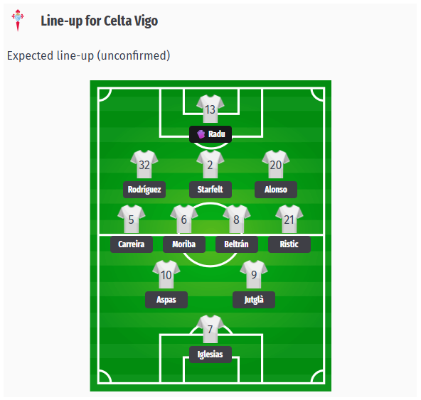 Αυτή η σύνθεση είναι μια πρόβλεψη, όχι επίσημη σύνθεση. Ο Claudio Giráldez αναμένεται να χρησιμοποιήσει και πάλι το σύστημα 3-4-2-1, το οποίο προσφέρει στην ομάδα αμυντική σταθερότητα με ευρεία επιθετική νότα.