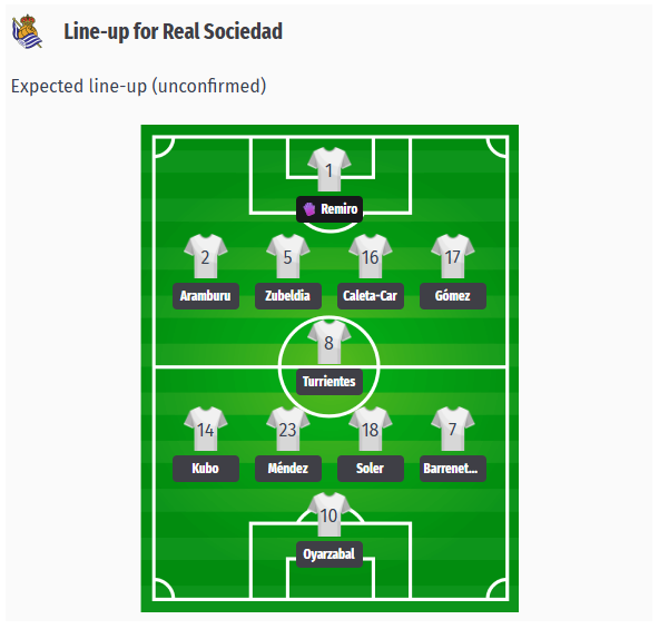 Ο προπονητής Sergio Francisco αναμένεται να επιστρέψει στο 4-1-4-1: Remiro στο τέρμα, αμυντική γραμμή Aramburu, Zubeldia, Caleta-Car και Gómez, Turrientes ως μοναδικός έξι, Kubo, Méndez, Soler και Barrenetxea στην επιθετική μεσαία γραμμή, Oyarzabal στην κορυφή.