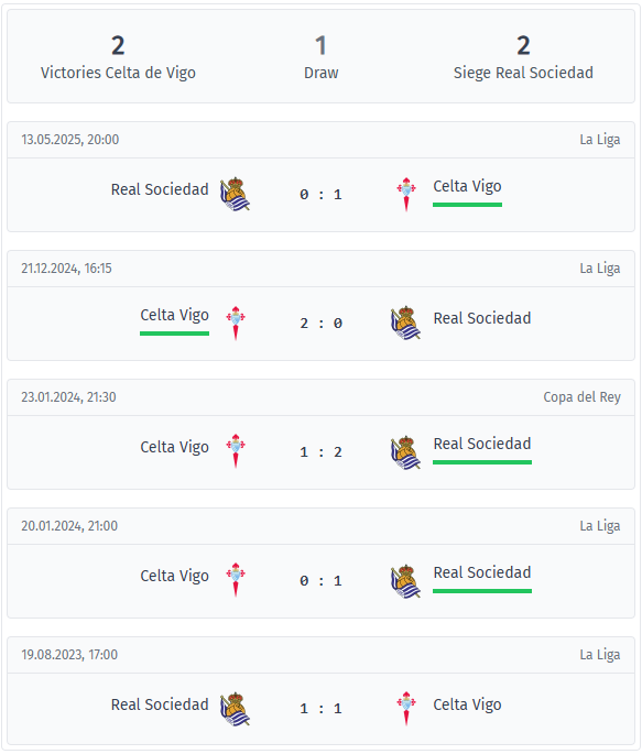 Τα τελευταία πέντε επίσημα παιχνίδια μεταξύ της Celta και της Real Sociedad είναι ισορροπημένα: δύο νίκες για κάθε ομάδα και μία ισοπαλία (Αύγουστος 2023). Η Celta κέρδισε τις δύο τελευταίες αναμετρήσεις (Δεκέμβριος 2024 2-0 εντός έδρας, Μάιος 2025 1-0 στο Σαν Σεμπαστιάν) και βρίσκεται έτσι μπροστά στην τρέχουσα σειρά αποτελεσμάτων.