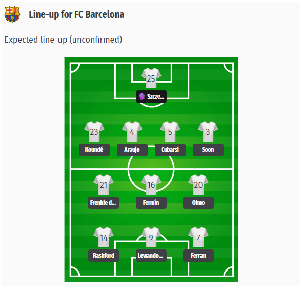 Στην άμυνα αναμένεται να παίξουν οι Ronald Araújo και Óscar Cubarsí στο κέντρο, πλαισιωμένοι από τους Jules Koundé και Alejandro Balde στις εξωτερικές θέσεις. Στην επίθεση, ο Robert Lewandowski αναμένεται να αναλάβει και πάλι το ρόλο του σκόρερ, παρά τις εικασίες για το μέλλον του. Στο τέρμα αναμένεται να αγωνιστεί ο Wojciech Szczęsny, καθώς τόσο ο Marc-André ter Stegen όσο και ο Joan García είναι τραυματίες. Παραμένει μια πρόβλεψη, καθώς η τελική σαφήνεια θα έρθει, όπως πάντα, με την επίσημη σύνθεση λίγο πριν την έναρξη του αγώνα.