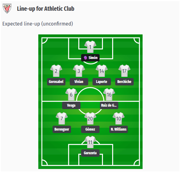 Ο Ερνέστο Βαλβέρδε αναμένεται να επιλέξει το 4-2-3-1 στο Καμπ Νου. Στο τέρμα θα βρίσκεται ο Ουνάι Σιμόν, μπροστά του μια τετράδα με τους Γκοροσάμπελ, Βιβιάν, Λαπόρτ και Μπερτσίτσε. Στο αμυντικό κέντρο θα παίξουν οι Vesga και Ruiz de Galarreta, στην επιθετική τριάδα θα υποστηρίξουν οι Berenguer, Gómez και Nico Williams, ενώ ο Guruzeta θα παίξει ως επιθετικός.