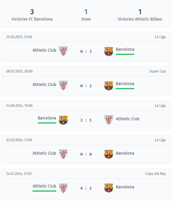 Μόνο μία φορά η Μπαρτσελόνα δεν σκόραρε σε αυτή τη σειρά, συγκεκριμένα στο 0-0 τον Μάρτιο του 2024. Από τη νίκη στο κύπελλο τον Ιανουάριο του 2024, η Αθλέτικ περιμένει μια νέα επιτυχία εναντίον της Μπαρτσελόνα και έχασε τις επόμενες αναμετρήσεις τον Αύγουστο του 2024, τον Ιανουάριο του 2025 και τον Μάιο του 2025. Συνολικά, το πρόσφατο ιστορικό μιλάει σαφώς υπέρ της Μπαρτσελόνα, με τις αναμετρήσεις να κρίνονται συνήθως νωρίς και με πιο σταθερή επιθετική απόδοση από την πλευρά των Καταλανών.