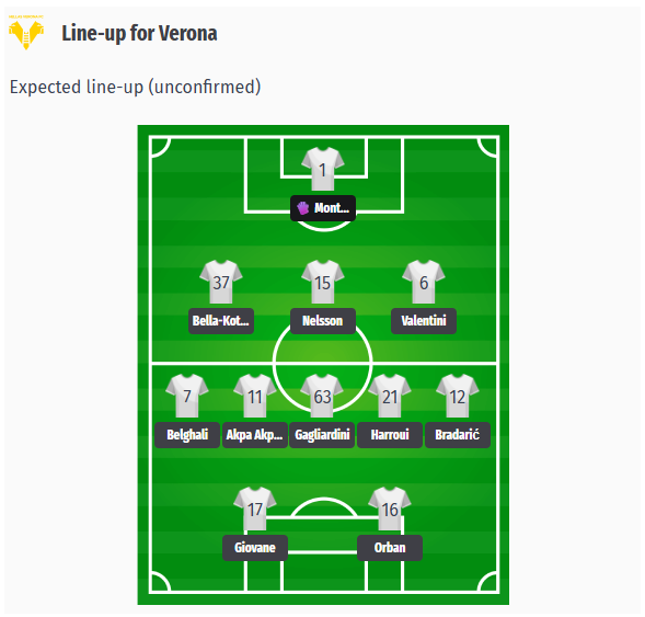 Στο κέντρο επιστρέφει ο Bernabé και αναμένεται να παίξει μαζί με τους Sørensen και Keita, ενώ τις πτέρυγες θα αναλάβουν οι Britschgi και Valeri. Στην επίθεση θα ξεκινήσουν οι Pellegrino και Cutrone.