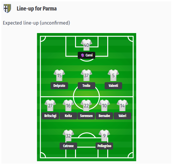 Η Πάρμα αναμένεται να αγωνιστεί με το συνηθισμένο σύστημα 3-5-2. Ο Troilo αντικαθιστά τον τραυματία Ndiaye στην τριάδα της άμυνας δίπλα στους Delprato και Valenti.