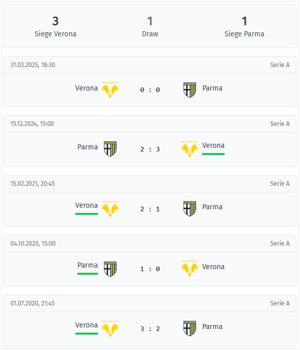 Η Βερόνα προηγείται στο ιστορικό των τελευταίων πέντε αναμετρήσεων με τρεις νίκες, η Πάρμα κέρδισε μία φορά, ενώ ένας αγώνας έληξε χωρίς γκολ τον Μάρτιο του 2025. Η προηγούμενη αναμέτρηση τον Δεκέμβριο του 2024 ήταν ένα γκολάτο 3-2 για τη Βερόνα στην Πάρμα. Παλαιότερες αναμετρήσεις από τα έτη 2020 και 2021 έδειξαν ένα παρόμοιο μοτίβο με στενά αποτελέσματα και πλεονέκτημα για την γηπεδούχο ομάδα.