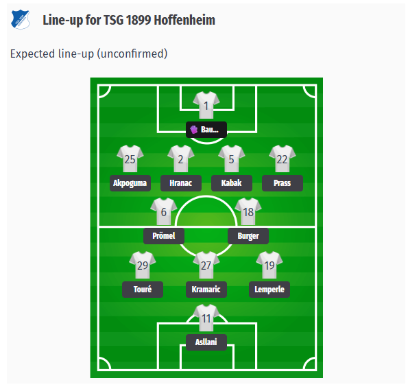 Ο προπονητής Christian Ilzer αναμένεται να παίξει και πάλι με σχηματισμό 4-2-3-1. Στο τέρμα θα είναι ο Baumann, την τετράδα της άμυνας θα σχηματίσουν οι Akpoguma, Hranac, Kabak και Prass. Το αμυντικό κέντρο θα καταλάβουν οι Prömel και Burger. Στην επιθετική τριάδα, οι Touré, Kramaric και Lemperle θα πρέπει να δώσουν ώθηση, ενώ στο κέντρο της επίθεσης αναμένεται ο Asllani, ο οποίος έχει σκοράρει έξι γκολ σε εννέα επίσημα παιχνίδια. Η Χόφενχαϊμ έχει πολλές απουσίες: μακροπρόθεσμα ο Χλόζεκ με κάταγμα στο σκαφοειδές οστό, καθώς και στην άμυνα οι Γκέντρε, Κουφάλ, Ματσίντα, Τσάβες και οι δύο νεαροί Φρες και Μπέρενς. Αυτές οι απουσίες εξηγούν τις περιορισμένες εναλλακτικές επιλογές του Ίλζερ και την εμπιστοσύνη του σε μια σταθερή βασική ενδεκάδα.