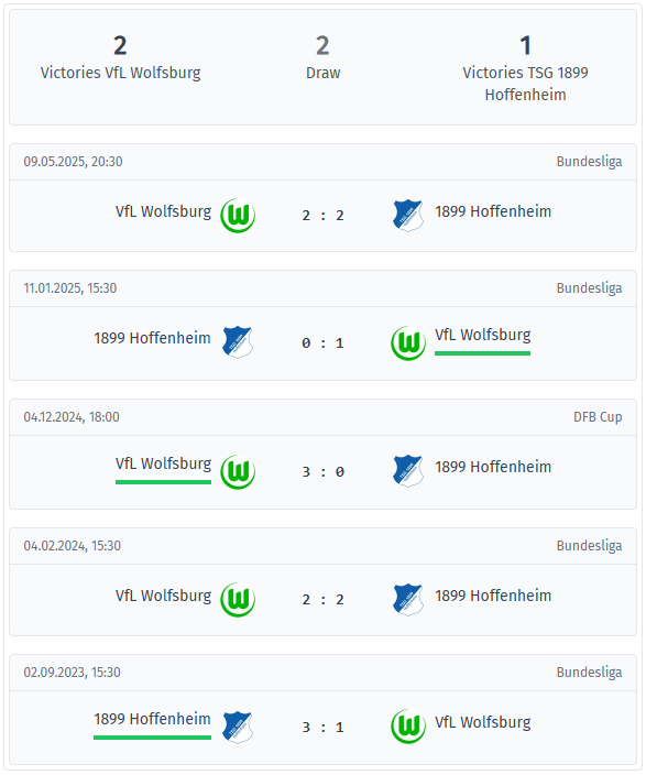 Το ισοζύγιο των τελευταίων πέντε επίσημων αγώνων είναι ελαφρώς υπέρ της Βόλφσμπουργκ: 2 νίκες για τη Βόλφσμπουργκ, 1 νίκη για την Χόφενχαϊμ και 2 ισοπαλίες. Οι αγώνες με πολλά γκολ κυριάρχησαν στη σειρά, με τους πέντε αγώνες να τελειώνουν με τουλάχιστον τρία γκολ. Η Βόλφσμπουργκ σκόραρε και στις πέντε αναμετρήσεις, ενώ η Χόφενχαϊμ δέχτηκε τουλάχιστον ένα γκολ σε κάθε αγώνα. Επισκόπηση των πιο πρόσφατων αποτελεσμάτων: Μάιος 2025 έληξε 2-2 στη Volkswagen Arena, Ιανουάριος 2025 η Βόλφσμπουργκ κέρδισε 1-0 εκτός έδρας στη Χόφενχαϊμ, Δεκέμβριος 2024 η Βόλφσμπουργκ κέρδισε 3-0 στον προημιτελικό του Κυπέλλου εντός έδρας. Άλλα παιχνίδια από το 2024 και το 2023 έληξαν 2-2 στο Βόλφσμπουργκ και 3-1 για την Χόφενχαϊμ στο Σίνσχαϊμ. Η αναμέτρηση χαρακτηρίζεται από την επιθετική διάθεση και των δύο ομάδων, ενώ η αμυντική συγκράτηση είναι σπάνια. Ιδιαίτερα τα δεύτερα ημίχρονα είχαν την τάση να είναι πλούσια σε γκολ, κάτι που υποδηλώνει αυξημένη ένταση και αλλαγές στην πορεία του παιχνιδιού μετά το διάλειμμα. Η Βόλφσμπουργκ έδειξε την ισχύ της εντός έδρας κατά τη διάρκεια αυτής της περιόδου και κατάφερε να πείσει με σημαντικές εντός έδρας νίκες. Με βάση το ιστορικό, είναι πιθανό να σημειωθούν περισσότερα από 2,5 γκολ και οι δύο ομάδες έχουν καλές πιθανότητες να σκοράρουν. Η Βόλφσμπουργκ έχει ένα μικρό ψυχολογικό πλεονέκτημα λόγω του συνήθως θετικού ισοζυγίου και του αποτελέσματος 3-0 στο κύπελλο εντός έδρας, ενώ η Χόφενχαϊμ παραμένει ανταγωνιστική χάρη στις εκτός έδρας νίκες και τις ισοπαλίες.