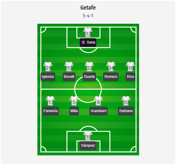 Η Χετάφε αναμένεται να αγωνιστεί με σχηματισμό 5-4-1, σύμφωνα με το βασικό σχήμα που χρησιμοποιεί συνήθως ο Μπορνταλάς. Ο Σόρια θα ξεκινήσει πίσω από την πεντάδα της άμυνας με τους Ιγκλέσιας, Μποσέλι, Ντουάρτε, Ρομέρο και Ρίκο, ενώ ο Μίλα και ο Αραμπάρι θα καθορίζουν το ρυθμό στο κέντρο του γηπέδου. Μετά τις πρόσφατες επιδόσεις του, ο Σόρια φαίνεται και πάλι να είναι μια βασική φιγούρα, ακόμα κι αν πρόκειται μόνο για μια προβλεπόμενη ενδεκάδα. Αυτό παραμένει περισσότερο μια πρόβλεψη παρά μια επιβεβαιωμένη ενδεκάδα, αλλά οι απουσίες δείχνουν αρκετά σαφώς μια συγκεκριμένη κατεύθυνση. Ο Μαγιαράλ συνεχίζει να απουσιάζει με τραυματισμό στο γόνατο, ο Καμάρα είναι εκτός, ο Νταβίντσι δεν είναι διαθέσιμος και ο Λίσο είναι τιμωρημένος, οπότε ο Βάσκεθ θα μπορούσε να ξεκινήσει μπροστά, με τον Σατριανό κοντά του. Αυτό θα άφηνε τη Χετάφε συμπαγή, άμεση και αρχικά προσανατολισμένη στον αμυντικό έλεγχο.