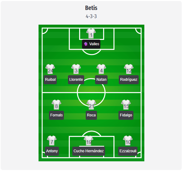Όπως αναμενόταν, η Μπέτις θα παραμείνει στο συνηθισμένο 4-3-3 με τον Βάλλες στο τέρμα και τετράδα με τους Ρουϊμπάλ, Λλορέντε, Νάταν και Ροντρίγκεθ. Ο Αντόνι θα ξεκινήσει πάλι δεξιά μετά την επιστροφή του στις προπονήσεις, ενώ ο Κουτσό θα αναλάβει την κορυφή και ο Εζαλζούλι θα επιτεθεί από τα αριστερά. Ωστόσο, όλα αυτά δεν έχουν επιβεβαιωθεί ακόμη. Η μεγαλύτερη αβεβαιότητα αφορά τον Ruibal, ο οποίος ήταν πρόσφατα τραυματίας, γι’ αυτό και η σύνθεση αυτή είναι μάλλον πιθανή παρά οριστική. Ο Gómez, που επιστρέφει μετά την τιμωρία του, δίνει επιπλέον ασφάλεια στην άμυνα του Pellegrini. Το μεγαλύτερο πρόβλημα βρίσκεται στο κέντρο, όπου οι απουσίες των Isco, Lo Celso και Amrabat ενδέχεται να μετατοπίσουν περισσότερες δημιουργικές και οργανωτικές ευθύνες στους Roca, Fornals και Fidalgo.