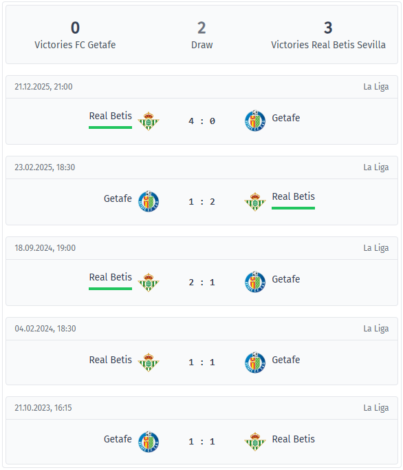 Οι τελευταίες πέντε αναμετρήσεις ήταν σαφώς υπέρ της Μπέτις, η οποία παρέμεινε αήττητη σε αυτή τη σειρά, με τρεις νίκες και δύο ισοπαλίες. Το πιο πρόσφατο παιχνίδι τον Δεκέμβριο του 2025 έληξε 4-0 για την ομάδα του Πελεγκρίνι, και η προηγούμενη αναμέτρηση στο Coliseum το 2025 έληξε με το ίδιο σκορ 2-1. Εξίσου σημαντικό είναι το γεγονός ότι η Χετάφε δεν προηγήθηκε στο ημίχρονο σε κανένα από αυτά τα πέντε παιχνίδια. Υπάρχει ένα αναγνωρίσιμο μοτίβο πίσω από τα αποτελέσματα. Και οι πέντε αναμετρήσεις είχαν περισσότερα από 1,5 γκολ, τέσσερις από αυτές είχαν λιγότερα από 3,5 γκολ, πριν το αποτέλεσμα του Δεκεμβρίου ξεφύγει από τα συνηθισμένα πλαίσια. Η Μπέτις σκόραρε και στις πέντε αναμετρήσεις, ενώ η Χετάφε είχε σκοράρει σε τέσσερις συνεχόμενες αναμετρήσεις πριν από το τελευταίο παιχνίδι, αλλά δεν κατάφερε να σκοράρει σε αυτό. Αυτός ο συνδυασμός εξηγεί γιατί η ισοπαλία και το «Και οι δύο ομάδες θα σκοράρουν: Ναι» πρέπει να ληφθούν σοβαρά υπόψη.