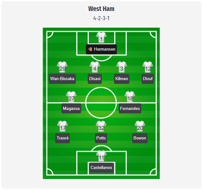 Η Γουέστ Χαμ αναμένεται να παραμείνει πιστή στο 4-2-3-1 που προτιμήθηκε τελευταία, αν και φυσικά πρόκειται μόνο για πρόβλεψη. Αν ο Αλφόνς Αρεόλα δεν είναι έτοιμος εγκαίρως, ο Μαντς Χερμάνσεν – 1 θα ξεκινήσει ως βασικός. Ο Άαρον Γουάν-Μπισάκα – 29 επιστρέφει στη δεξιά πλευρά της άμυνας, ενώ ο Σουνγκούτου Μαγκάσα – 27 αναμένεται να προσφέρει περισσότερη σταθερότητα στο κέντρο του γηπέδου δίπλα στον Ματέους Φερνάντες – 18.