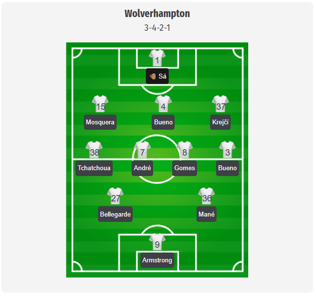 Το δίδυμο του κέντρου, André – 7 και João Gomes – 8, θα είναι καθοριστικό για το αν οι Wolves θα καταφέρουν να πάρουν τον έλεγχο του παιχνιδιού. Μπροστά τους, οι Jean-Ricner Bellegarde – 27 και Mateus Mané – 36 θα υποστηρίξουν τον επιθετικό Adam Armstrong – 9. Δεδομένου ότι ο Enso González εξακολουθεί να απουσιάζει και ο Sam Johnstone δεν είναι διαθέσιμος, δεν υπάρχουν λόγοι να αναμένουμε σημαντικές τακτικές αλλαγές.
