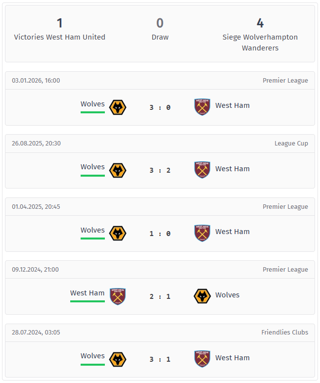 Η μοναδική επιτυχία της West Ham σε αυτή την περίοδο σημειώθηκε το 2024 στο London Stadium, όταν κέρδισαν 2-1. Πέρα από τα καθαρά αποτελέσματα, το μοτίβο είναι εμφανές: οι Wolves έχουν σκοράρει και στα πέντε παιχνίδια, ενώ η West Ham έχει δεχτεί γκολ και στα πέντε. Αυτό δίνει στους φιλοξενούμενους ένα ψυχολογικό πλεονέκτημα, ακόμα κι αν οι τρέχουσες αποδόσεις των στοιχημάτων δείχνουν κάτι διαφορετικό.