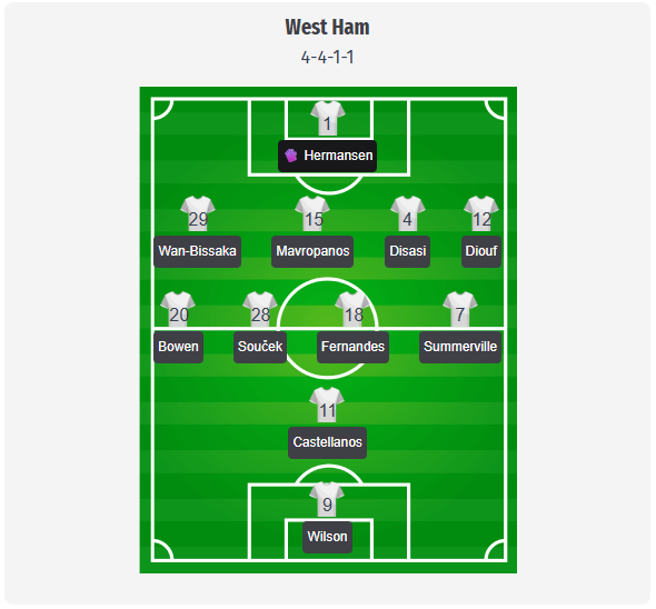 Η Γουέστ Χαμ αναμένεται να ξεκινήσει με σχηματισμό 4-4-1-1, με τον Χερμάνσεν ως πιθανό νούμερο ένα πίσω από τους Γουάν-Μπισάκα, Μαυροπάνο, Ντισάσι και Ντιούφ. Η διάταξη υποδηλώνει ένα συμπαγές μπλοκ και γρήγορες αντεπιθέσεις, με τους Μπόουεν και Σάμερβιλ να είναι οι σημαντικότεροι παίκτες στις πτέρυγες. Ο Castellanos θα πρέπει να ενεργεί πίσω από τον Wilson και να προσπαθεί να μετατρέψει τις στιγμές αλλαγής σε γρήγορες τελικές προσπάθειες ή σε στημένα. Η επιλογή θα μπορούσε να εξαρτηθεί σε μεγάλο βαθμό από τη διαθεσιμότητα. Ο Fabianski εξακολουθεί να είναι εκτός λόγω προβλημάτων στην πλάτη, οπότε η ερώτηση για τον τερματοφύλακα φαίνεται να βρίσκεται μεταξύ Hermansen και Areola. Ο Todibo θα μπορούσε να λείψει μετά την κόκκινη κάρτα που δέχτηκε εναντίον της Chelsea, οπότε ο ρόλος του Disasi δίπλα στον Mavropanos φαίνεται σχεδόν περισσότερο από μια απλή υπόθεση. Στο κέντρο, οι Σούτσεκ και Φερνάντες θα αποτελέσουν τη σταθερή βάση, με τον Σούτσεκ να αποτελεί σαφή απειλή στις στημένες φάσεις.