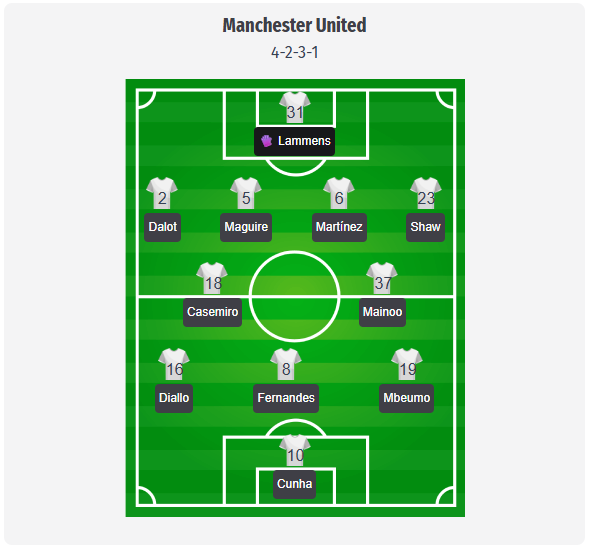 Η Μάντσεστερ Γιουνάιτεντ θα διατηρήσει πιθανώς το 4-2-3-1 του Κάρικ, αν και αυτό είναι περισσότερο μια πρόβλεψη παρά μια επιβεβαιωμένη ενδεκάδα. Ο Λάμενς θα μπορούσε να διατηρήσει τη θέση του πίσω από τους Νταλότ, Μαγκουάιρ, Μαρτίνεζ και Σο. Καθώς ο Ντε Λιχτ εξακολουθεί να είναι εκτός λόγω προβλημάτων στην πλάτη και ο Ντοργκου λόγω τραυματισμού στο μηρό, όλα δείχνουν ότι θα υπάρξει συνέχεια στην αμυντική γραμμή. Σε περίπτωση που χρειαστεί αλλαγή, οι Mazraoui ή Yoro θεωρούνται οι πιο πιθανές επιλογές για αναδιάταξη. Οι Casemiro και Mainoo φαίνονται ως πιθανό δίδυμο στο κέντρο, δίνοντας έτσι στον Fernandes την ελευθερία να ενεργεί μεταξύ των γραμμών, ενώ οι Diallo και Mbeumo προσφέρουν άμεση πλάτος. Ο Cunha αναμένεται να ξεκινήσει μπροστά, πέφτοντας συχνά πίσω για να συνδέσει το παιχνίδι και να ανοίξει χώρους για τις καθυστερημένες κούρσες του Fernandes. Αν ο Carrick θέλει φρέσκα πόδια ή περισσότερο έλεγχο, οι Ugarte και Mount είναι οι σαφείς εναλλακτικές επιλογές από τον πάγκο.