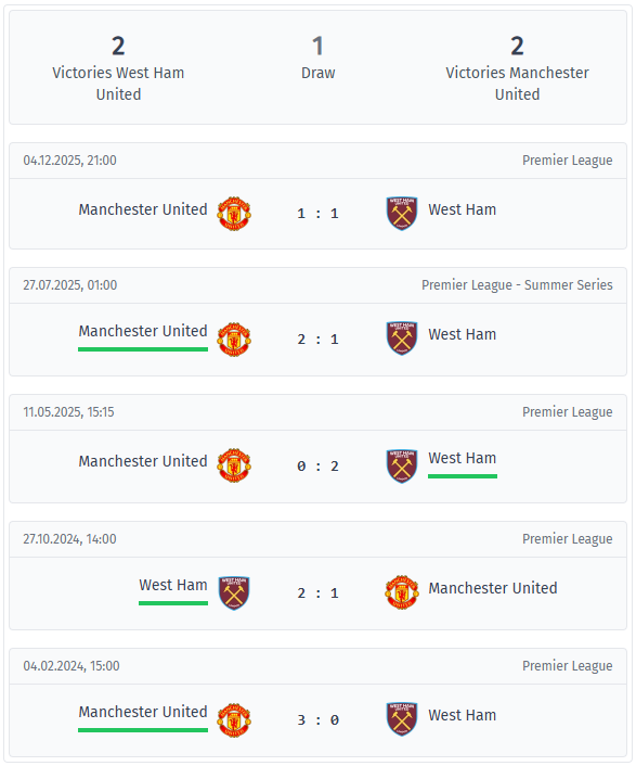 Τα τελευταία πέντε παιχνίδια ήταν πιο ισορροπημένα από ό,τι δείχνει ο πίνακας, με το τελευταίο να έχει λήξει 1-1 τον Δεκέμβριο του 2025. Τον Ιούλιο του 2025, η Γιουνάιτεντ κέρδισε 2-1 στην Premier League Summer Series, ενώ τον Μάιο του 2025 η Γουέστ Χαμ επικράτησε 2-0. Αν κοιτάξουμε το 2024, η West Ham κέρδισε 2-1 στο γήπεδό της, ενώ το καλύτερο αποτέλεσμα της United σε αυτή τη σειρά ήταν 3-0 στο γήπεδό της την ίδια χρονιά. Σε αυτά τα πέντε παιχνίδια υπάρχει ένα σαφές μοτίβο: κάθε πρώτο ημίχρονο έμεινε κάτω από 1,5 γκολ, κάτι που υποδηλώνει προσεκτικές εκκινήσεις και πολύ προσήλωση στην ανίχνευση ευκαιριών μέχρι να ανοίξουν χώροι. Ταυτόχρονα, στο τέλος όλα τα παιχνίδια είχαν πάνω από 1,5 γκολ και παρέμειναν σταθερά κάτω από 3,5, οπότε η περιοχή μεταξύ των δύο ήταν κάτι σαν ζώνη άνεσης. Στο δεύτερο ημίχρονο τείνουν να πέφτουν περισσότερα γκολ, κάτι που ταιριάζει με την ιδέα ότι το παιχνίδι ανοίγει μόλις σπάσει το πρώτο τακτικό μπλοκάρισμα.