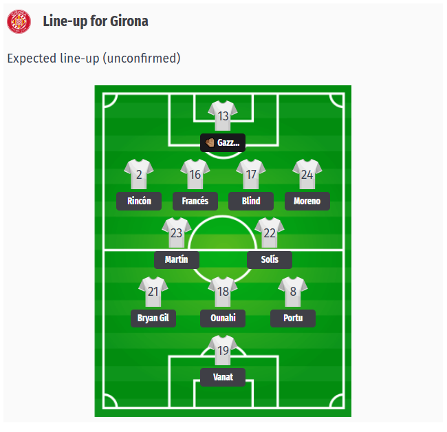 Ο Míchel αναμένεται να διατηρήσει την αποδεδειγμένη του διάταξη 4-2-3-1, παρόλο που τα προβλήματα στο ρόστερ αυξάνονται. Μετά τον σοβαρό τραυματισμό του van de Beek, ο οποίος πιθανώς έσπασε τον αχίλλειο τένοντα, ο Ounahi θα αναλάβει έναν ακόμη πιο σημαντικό ρόλο στην επίθεση. Ο Μαροκινός έδειξε πρόσφατα ισχυρές επιδόσεις στο San Mamés και θα μπορούσε να παίξει πίσω από τον επιθετικό Vanat. Στην άμυνα, ο Francés θα διατηρήσει πιθανότατα την εμπιστοσύνη μετά την πειστική του εμφάνιση εναντίον της Athletic Bilbao. Οι απουσίες των Tsygankov και Juan Carlos περιορίζουν περαιτέρω τις επιλογές, οπότε οι Bryan Gil και Portu θα μπορούσαν να καλύψουν τις θέσεις στα πλάγια. Ο Gazzaniga θα είναι πιθανότατα ξανά κάτω από τα δοκάρια μετά τις σημαντικές του επεμβάσεις στη Χώρα των Βάσκων.
