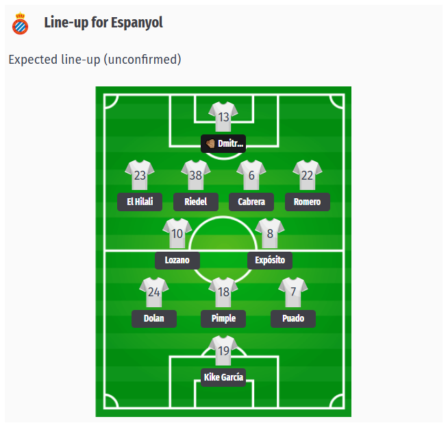 Ο Manolo González αναμένεται να βασιστεί στην αποδεδειγμένη διάταξη 4-2-3-1 της Εσπανιόλ, με την οποία η ομάδα έχει δείξει πρόσφατα πειστικές επιδόσεις. Στο τέρμα θα βρίσκεται πιθανώς ο Dmitrovic, ενώ η άμυνα θα αποτελείται από τους El Hilali, Riedel, Cabrera και Romero. Ο Romero χρειάστηκε να υποβληθεί σε θεραπεία για αιμορραγικό τραύμα στο κεφάλι μετά από την αναμέτρηση με τη Ρεάλ Μαδρίτης, όταν ο Mastantuono τον χτύπησε με τα μποτάκια του. Το κεντρικό μέσο θα αποτελείται πιθανότατα από τους Lozano και Expósito, ενώ πίσω τους θα βρίσκονται οι Dolan, Pickel και ο έμπειρος Puado για τις επιθετικές θέσεις. Στην κορυφή της επίθεσης θα βρίσκεται πιθανότατα ο Kike García. Αυτή η σύνθεση είναι όμως μόνο μια πρόβλεψη, καθώς ο González θα ανακοινώσει την τελική ενδεκάδα λίγο πριν την έναρξη του αγώνα.
