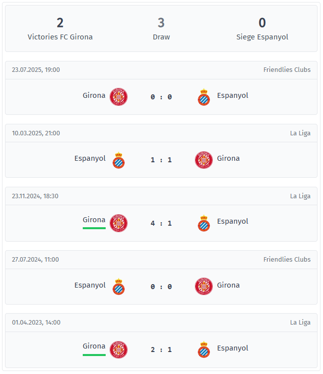 Τα τελευταία πέντε παιχνίδια μεταξύ της Girona και της Espanyol παρουσιάζουν μια ενδιαφέρουσα εικόνα: οι Καταλανοί από τη Girona παραμένουν αήττητοι απέναντι στην Espanyol, με δύο νίκες και τρεις ισοπαλίες. Η Εσπανιόλ δεν έχει κερδίσει ποτέ σε αυτές τις αναμετρήσεις. Η τελευταία αναμέτρηση τον Ιούλιο του 2025 έληξε χωρίς γκολ, ένα φιλικό παιχνίδι που δεν επιτρέπει πολλά συμπεράσματα για την ισορροπία δυνάμεων. Πολύ πιο ενδεικτικό ήταν το 4-1 της Χιρόνα τον Νοέμβριο του 2024 στο πρωτάθλημα, μια σαφής δήλωση ενάντια στους Pericos. Είναι αξιοσημείωτη η τάση για χαμηλό σκορ στο πρώτο ημίχρονο μεταξύ των δύο ομάδων. Στο 80% των αναμετρήσεων το σκορ παρέμεινε 0-0 στο ημίχρονο, κάτι που υποδηλώνει τακτικά παιχνίδια. Η Χιρόνα δεν δέχτηκε γκολ στο πρώτο ημίχρονο εναντίον της Εσπανιόλ, ενώ η Εσπανιόλ δεν έχει σκοράρει ποτέ σε αυτή τη φάση. Τα στατιστικά μιλούν από μόνα τους: η Χιρόνα κυριαρχεί σαφώς σε αυτή την αναμέτρηση και έχει το πάνω χέρι στις μεταξύ τους αναμετρήσεις. Η Εσπανιόλ εξακολουθεί να περιμένει την πρώτη της νίκη επί των Χιρονίνων τα τελευταία χρόνια.