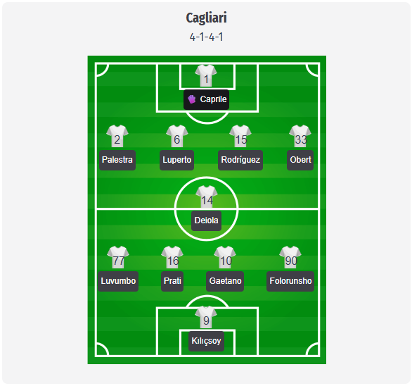 Στην Κάλιαρι, η προβλεπόμενη ενδεκάδα θα έχει τον Caprile στο τέρμα, μπροστά του μια τετράδα με τους Palestra, Luperto, Rodríguez και Obert, στη θέση του αμυντικού μέσου θα παίξει ο Deiola, ενώ στο επιθετικό μέσο θα υποστηρίξουν τον επιθετικό Kılıçsoy οι Luvumbo, Prati, Gaetano και Folorunsho.