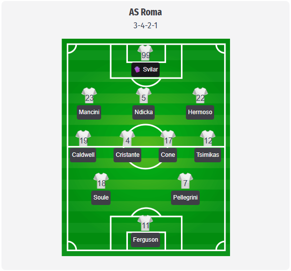 Η AS Ρόμα αναμένεται να αγωνιστεί και πάλι με το σύστημα 3-4-2-1, με μια σταθερή τριάδα αμυντικών και δύο πλάγιους αμυντικούς, οι οποίοι έχουν συμβάλει σε μεγάλο βαθμό στην ισχυρή αμυντική επίδοση της ομάδας αυτή τη σεζόν.