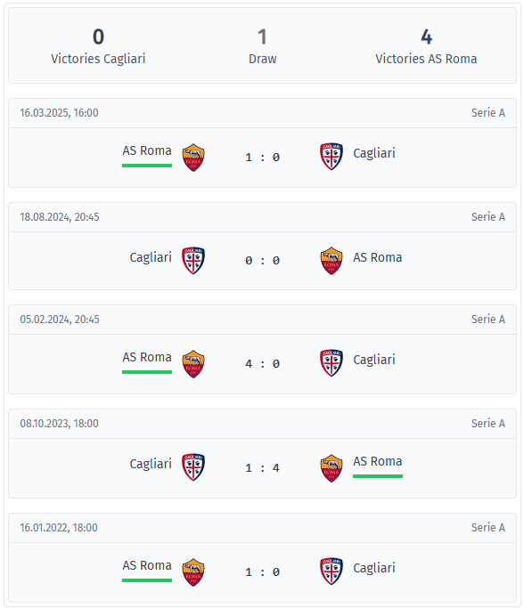 Σε αυτά τα πέντε παιχνίδια, η Κάλιαρι σκόραρε μόνο μία φορά, στο 4:1 το 2023, ενώ η AS Ρόμα σκόραρε σε τέσσερα από τα πέντε παιχνίδια, γεγονός που υπογραμμίζει τα προβλήματα της Σαρδηνίας στην επίθεση και τη σταθερότητα των Giallorossi. Από ψυχολογική και τακτική άποψη, πολλά συνηγορούν υπέρ της AS Ρόμα. Για να σπάσει αυτό το μοτίβο, η Κάλιαρι χρειάζεται περισσότερες δημιουργικές ιδέες στο τελευταίο τρίτο του γηπέδου και καλύτερη αξιοποίηση των ευκαιριών. Με βάση τα πρόσφατα ντέρμπι, ένα παιχνίδι με λίγα γκολ ή μια μικρή νίκη για την AS Ρόμα εξακολουθεί να φαίνεται ως το πιο πιθανό σενάριο.