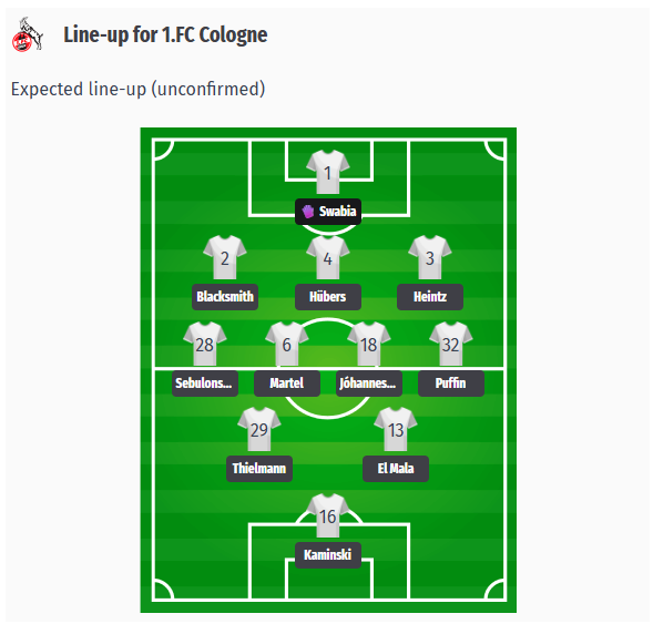 Η προβλεπόμενη σύνθεση της Κολωνίας θα επηρεαστεί από αρκετές απουσίες. Στην άμυνα εξακολουθούν να λείπουν οι van den Berg και Kilian, γεγονός που ασκεί πίεση στους υπόλοιπους κεντρικούς αμυντικούς. Στο κέντρο και στην επίθεση, ο Kwasniok ενδέχεται να πρέπει να κάνει χωρίς τον Bülter. Η ακριβής σύνθεση και η επιλογή των παικτών θα εξαρτηθεί από τις εντυπώσεις της τελευταίας προπόνησης. Ο El Mala και ο Kaminski θα είναι στην επίθεση, ενώ ο Ache θα περιμένει την ευκαιρία του.