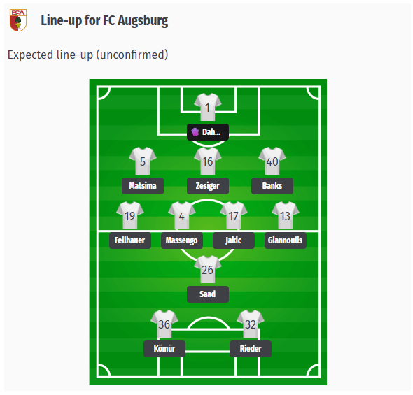 Αθλητικά, οι ομάδες απέχουν πολύ μεταξύ τους: ο Lukas Kwasniok έχει προετοιμάσει την Κολωνία με τον καλύτερο τρόπο μετά την άνοδο, η αξία του ρόστερ αυξήθηκε από 77 σε 106 εκατομμύρια ευρώ. Ο El Mala, με αγοραία αξία 18 εκατομμυρίων ευρώ ο πιο ακριβός παίκτης του ρόστερ, παρακολουθείται σε όλη την Ευρώπη και έχει συμμετάσχει σε γκολ ή ασίστ και στις πέντε αγωνιστικές του πρωταθλήματος. Η Άουγκσμπουργκ, από την άλλη πλευρά, μετά από 100 ημέρες υπό την ηγεσία του Sandro Wagner, βιώνει μια σειρά από σκαμπανεβάσματα. Μετά την πολλά υποσχόμενη νίκη στην πρεμιέρα στο Φράιμπουργκ, ακολούθησαν τέσσερις συνεχόμενες ήττες, πριν το 3-1 εναντίον της Βόλφσμπουργκ επαναφέρει την αυτοπεποίθηση. Ο Wagner στηρίζεται όλο και περισσότερο σε παίκτες από τις ακαδημίες του συλλόγου, όπως ο Mert Kömür, ο οποίος έχει ήδη συμβάλει με δύο γκολ και δύο ασίστ, καθώς και ο Noahkai Banks. Μια πιθανή ελπίδα: ο αρχηγός Jeffrey Gouweleeuw θα μπορούσε να είναι και πάλι μια επιλογή, αφού ξεπέρασε το σχίσιμο του εσωτερικού συνδέσμου.