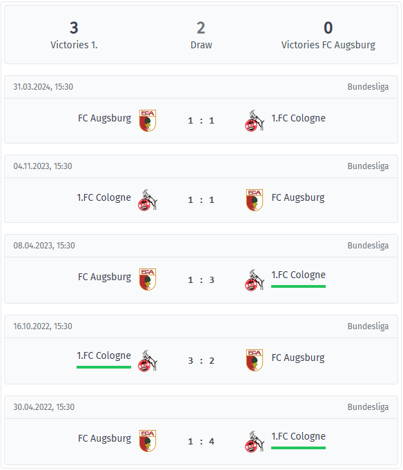 Και οι πέντε αγώνες ήταν πλούσιοι σε γκολ με τουλάχιστον δύο γκολ, με τις δύο ομάδες να σκοράρουν τουλάχιστον μία φορά η καθεμία. Η Άουγκσμπουργκ περιμένει πάνω από τρία χρόνια για μια νίκη επί της Κολωνίας, με τον Βάγκνερ και την ομάδα του να βρίσκονται υπό πίεση να τερματίσουν επιτέλους αυτή την αρνητική σειρά.