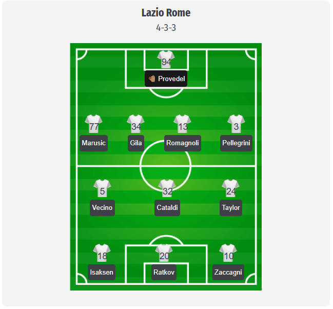 Ο Sarri θα παραμείνει πιθανότατα στο συνηθισμένο 4-3-3, με τον Provedel να είναι ο πιο πιθανός τερματοφύλακας. Καθώς ο Gigot συνεχίζει την αποκατάσταση μετά την εγχείρηση στον αστράγαλο και ο Patric είναι τραυματίας λόγω μυϊκών προβλημάτων, η κεντρική άμυνα θα αποτελείται από τους Gila και Romagnoli. Ο Marusic φαίνεται να είναι η σίγουρη επιλογή για τη δεξιά πλευρά, ενώ ο Pellegrini είναι προγραμματισμένος να ξεκινήσει στην αριστερή. Με τον Dele Bashiru εκτός ομάδας και τον Bašić τραυματία, όλα δείχνουν ότι ο Vecino και ο Taylor θα αγωνιστούν ως οκτάρια αριστερά και δεξιά του Cataldi, ένα τρίο που θα διατηρήσει τον ρυθμό των πασών της Λάτσιο και ταυτόχρονα θα ασφαλίσει την τελευταία γραμμή. Στην επίθεση, η συμμετοχή του Dias στο Κύπελλο Αφρικής ανοίγει πιθανώς τον δρόμο για τον Ratkov ως εννιάρι, πλαισιωμένο από τους Isaksen και Zaccagni. Οι Rovella, Pedro και Tavares θα μπορούσαν να έχουν αντίκτυπο ως αναπληρωματικοί.