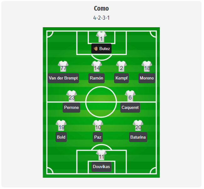 Ο Φάμπρεγας θα παραμείνει πιθανότατα στο 4-2-3-1, με τον Μπουτέζ πίσω από την τετράδα των Βαν ντερ Μπρεμπτ, Ραμόν, Κέμπφ και Μορένο. Το δίδυμο των Περρόνε και Κακερέτ θα καθορίζει τον ρυθμό και θα καλύπτει τον Παζ, ώστε να μπορεί να εμφανίζεται ανάμεσα στις γραμμές. Ο Kühn και ο Baturina είναι οι πιο πιθανές επιλογές για τις πάσες από τα πλάγια, ενώ μπροστά έχει προγραμματιστεί ο Douvikas. Είναι αναμενόμενο ότι οι πλάγιοι αμυντικοί θα προωθούνται συνεχώς για να δώσουν πλάτος. Οι τραυματισμοί επηρεάζουν τις επιλογές στην επίθεση. Ο Morata εξακολουθεί να απουσιάζει, οπότε ο Douvikas φαίνεται ως η πιο λογική επιλογή για την επίθεση, ενώ ο Cerri θα ήταν μια εναλλακτική λύση από τον πάγκο. Στα πλάγια, οι Diao και Addai είναι επίσης εκτός, οπότε ο Jesús Rodríguez θα μπορούσε να είναι η πρώτη αλλαγή όταν χρειαστούν φρέσκα πόδια. Ο Goldaniga είναι κοντά στην επιστροφή μετά από προβλήματα στον αστράγαλο, αλλά σε αυτή την πρόβλεψη ο Ramón παραμένει στην αρχική ενδεκάδα.
