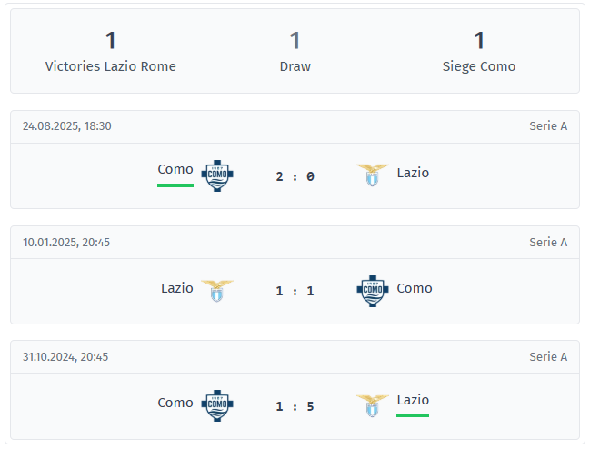Στις τρεις τελευταίες αναμετρήσεις, το ισοζύγιο είναι απολύτως ισορροπημένο, με μία νίκη και μία ισοπαλία για κάθε ομάδα. Τον Αύγουστο του 2025, η Κόμο νίκησε τη Λάτσιο Ρώμης με 2-0, ένα καθαρό και ελεγχόμενο αποτέλεσμα. Στις αρχές του 2025, η αναμέτρηση στη Ρώμη έληξε 1-1. Το 2024, η Λάτσιο Ρώμης κέρδισε εκτός έδρας με 5-1, το πιο σαφές αποτέλεσμα σε αυτή τη σειρά. Το πιο αξιοσημείωτο μοτίβο σε αυτά τα τρία παιχνίδια είναι το timing. Η Κόμο σκόραρε και στα τρία παιχνίδια στο δεύτερο ημίχρονο και ποτέ πριν το ημίχρονο, ενώ η Λάτσιο Ρώμης δέχτηκε γκολ κάθε φορά μετά την αλλαγή πλευράς. Και τα τρία παιχνίδια είχαν συνολικά πάνω από 1,5 γκολ, αλλά η τάση κυμάνθηκε σημαντικά, από το 5-1 της Λάτσιο το 2024 έως την άγονο εμφάνιση της Λάτσιο τον Αύγουστο του 2025. Είναι ενδιαφέρον ότι το πρόβλημα της Λάτσιο να κρατήσει την Κόμο σε απόσταση για 90 λεπτά είναι σταθερό, καθώς η Κόμο σκόραρε τουλάχιστον ένα γκολ σε κάθε παιχνίδι, ακόμη και στην σαφή ήττα του 2024. Η μόνη ισοπαλία, το 2025, είχε περισσότερο ένταση στο τέλος παρά έλεγχο στην αρχή, επειδή καμία ομάδα δεν κατάφερε να ξεφύγει πριν το ημίχρονο. Αν αυτή η τάση συνεχιστεί, το δεύτερο ημίχρονο θα μπορούσε να είναι και πάλι καθοριστικό.