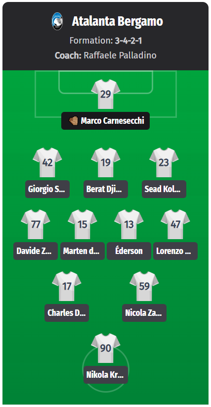 Αυτή είναι ακόμα μια πρόβλεψη, αλλά η Αταλάντα αναμένεται να αγωνιστεί υπό τον Ραφαέλε Παλαντίνο με το συνηθισμένο 3-4-2-1. Ο Μάρκο Καρνεσέκι (Νο. 29) θα βρίσκεται πιθανώς πίσω από τον Τζιόρτζιο Σκαλβίνι (Νο. 42), Berat Djimsiti (αρ. 19) και Sead Kolasinac (αρ. 23), ενώ η επιστροφή των δύο τελευταίων στις προπονήσεις της ομάδας αποτελεί καλό σημάδι. Ο Davide Zappacosta (αρ. 77) και ο Raoul Bellanova (αρ. 16) αναμένεται να καλύψουν τις πτέρυγες.