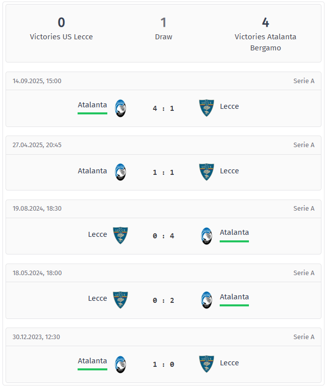 Οι τελευταίες πέντε αναμετρήσεις μιλούν ξεκάθαρα υπέρ της Αταλάντα: τέσσερις νίκες, μία ισοπαλία. Το πιο ενδεικτικό αποτέλεσμα ήταν το παιχνίδι του Σεπτεμβρίου 2025, όταν οι Μπεργκαμάσκοι νίκησαν τη Λέτσε με 4-1. Ακόμη και εκείνο το παιχνίδι στο οποίο η Λέτσε δεν ηττήθηκε, τον Απρίλιο του 2025, τελείωσε υπό τον έλεγχο της Αταλάντα και καταδεικνύει πόσο ξεκάθαρη είναι η ισορροπία δυνάμεων με την πάροδο του χρόνου.