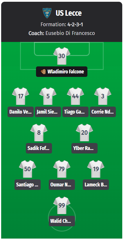 • Πολλές απουσίες αποδυναμώνουν τη Λέτσε: Οι Γκάσπαρ, Μεντόν Μπερίσα, Λασάνα Κουλιμπαλί και Φραντσέσκο Καμάρδα απουσιάζουν – η αμυντική σταθερότητα και η κυκλοφορία της μπάλας επηρεάζονται.