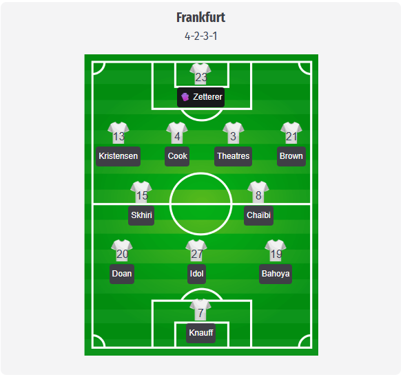 Ο Dino Toppmöller αναμένεται να ξεκινήσει με σχηματισμό 4-2-3-1, με τον Zetterer στο τέρμα και τετράδα άμυνας με τους Kristensen, Koch, Theate και Brown. Στο κέντρο του γηπέδου αναμένεται να αγωνιστούν οι Skhiri και Chaïbi, ενώ στο επιθετικό τρίγωνο θα βρίσκονται οι Doan στα δεξιά, Götze στο κέντρο και Bahoya στα αριστερά, με τον Knauff να αναλαμβάνει την κορυφή της επίθεσης.