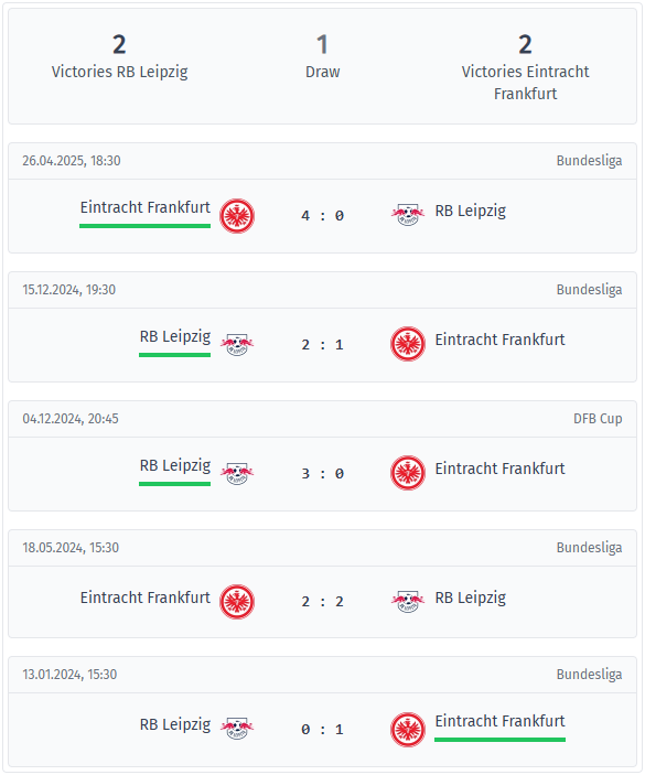 Ο απολογισμός των τελευταίων πέντε συναντήσεων είναι ισορροπημένος, με δύο νίκες για τη Λειψία, δύο για τη Φρανκφούρτη και μία ισοπαλία. Το εύρος των αποτελεσμάτων υποδηλώνει έντονες διακυμάνσεις στην καθημερινή φόρμα και διαφορετικές τακτικές προσεγγίσεις. Η πιο πρόσφατη αναμέτρηση τον Απρίλιο του 2025 έληξε με μια σαφή εκτός έδρας νίκη 4-0 για τη Φρανκφούρτη, ενώ προηγουμένως η Λειψία είχε κερδίσει δύο φορές τον Δεκέμβριο του 2024, με 3-0 στο Κύπελλο DFB και 2-1 στη Μπουντεσλίγκα. Σε αυτά προστίθενται ένα 2-2 τον Μάιο του 2024 και μια νίκη 1-0 για τη Φρανκφούρτη στις αρχές του 2024.