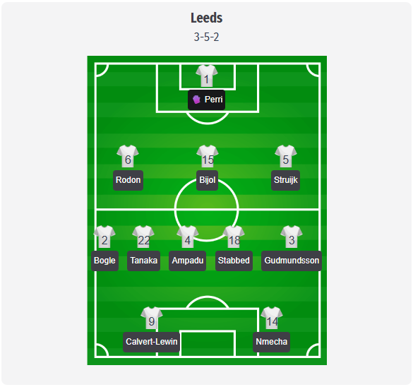 Στο Λιντς, πολλά δείχνουν ότι ο Ντάνιελ Φάρκε θα επιλέξει το 3-5-2, με σαφή κατανομή ρόλων στην τριάδα της άμυνας και στο κέντρο, ενώ στην επίθεση θα υπάρχει ευελιξία. Ανάλογα με τη διαθεσιμότητα των Nmecha ή Calvert-Lewin, ο Farke θα μπορούσε να ξεκινήσει με δύο σωματικά δυνατούς επιθετικούς ή να επιλέξει μια παραλλαγή με μόνο έναν από αυτούς τους επιθετικούς, σταθμίζοντας έτσι μεταξύ μεγαλύτερης παρουσίας στο κέντρο και επιπλέον κάλυψης στο κέντρο.