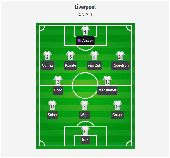 Η Λίβερπουλ αναμένεται να ξεκινήσει με το γνωστό 4-2-3-1, με τον Alisson να επιστρέφει στο τέρμα μετά την αποθεραπεία του, ενώ μπροστά του αναμένεται να αγωνιστεί η τετράδα των Gomez, Konaté, van Dijk και Robertson. Στο αμυντικό κέντρο θα παίξουν οι Endo και Mac Allister, ενώ μπροστά τους οι Salah, Wirtz και Gakpo θα σχηματίσουν την επιθετική τριάδα πίσω από τον κεντρικό επιθετικό Isak. Μια σημαντική αρνητική είδηση αφορά τον Bradley, ο οποίος θα απουσιάσει λόγω μυϊκού τραυματισμού και η αγοραία αξία του εκτιμάται σε περίπου 30 εκατομμύρια ευρώ.