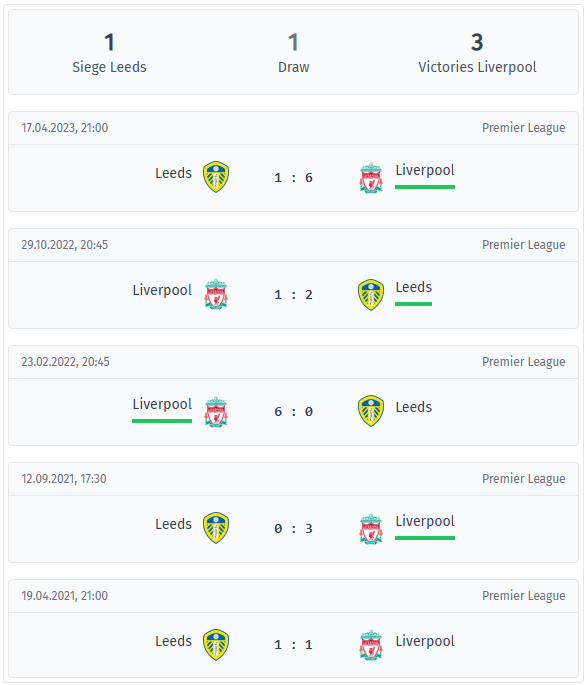 Οι τελευταίες πέντε αναμετρήσεις μεταξύ της Λιντς Γιουνάιτεντ και της Λίβερπουλ FC είναι σαφώς υπέρ των Ρεντς, με τρεις νίκες για τη Λίβερπουλ, μία για τη Λιντς και μία ισοπαλία, ενώ αξιοσημείωτα είναι τα συχνά υψηλά αποτελέσματα, όπως η τελευταία εκτός έδρας νίκη με 6-1 στο Έλαντ Ρόουντ τον Απρίλιο του 2023. Η Λιντς πέτυχε τη μοναδική της νίκη σε αυτή τη φάση εκτός έδρας με 2-1 στο Anfield τον Οκτώβριο του 2022, αλλιώς η Λίβερπουλ κυριάρχησε στις αναμετρήσεις, ειδικά στα πρώτα ημίχρονα, καθώς και στις πέντε αναμετρήσεις οι Reds σκόραραν πριν το ημίχρονο και η Λιντς δέχτηκε τουλάχιστον ένα γκολ πριν την αλλαγή των πλευρών. Ο αριθμός των γκολ ήταν συνολικά υψηλός, με κάθε ένα από τα πέντε παιχνίδια να έχει τουλάχιστον δύο γκολ, σε τέσσερα παιχνίδια ξεπεράστηκε το όριο των 2,5 γκολ, η Λίβερπουλ σκόραρε τουλάχιστον ένα γκολ σε όλα τα παιχνίδια και η Λιντς παρέμεινε χωρίς να κρατήσει το μηδέν σε αυτή τη σειρά και υπέστη δύο ιδιαίτερα σαφείς ήττες με 6-0 και 6-1. Για τη Λιντς και τον προπονητή Ντάνιελ Φάρκε, αυτό σημαίνει ένα σαφές καθήκον, δηλαδή να βρουν γρήγορα συμπαγή και σταθερή άμυνα, ειδικά στις αρχικές φάσεις, όπου η Λίβερπουλ χτυπούσε τακτικά νωρίς στις τελευταίες αναμετρήσεις.