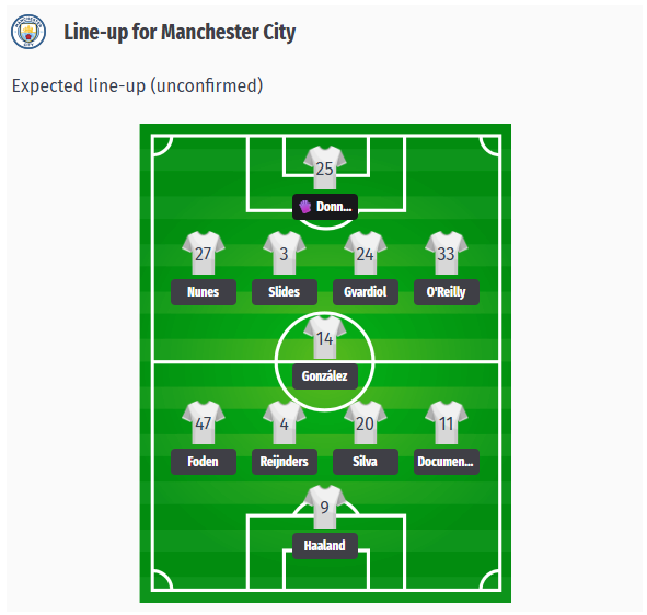 Ο Pep Guardiola αναμένεται να αγωνιστεί με το συνηθισμένο σύστημα, αν και υπάρχουν μερικές αμφιβολίες σχετικά με τη σύνθεση. Ο Gianluigi Donnarumma είναι εκπληκτικά ο βασικός τερματοφύλακας, αφού κατάφερε να κερδίσει τη θέση του στις πρώτες εβδομάδες. Στην άμυνα, ο O’Reilly φαίνεται ότι θα ξεκινήσει στην αριστερή πλευρά. Ο Rayan Aït-Nouri εξακολουθεί να απουσιάζει λόγω προβλημάτων στον αστράγαλο και ενδέχεται να επιστρέψει μόνο στα τέλη Οκτωβρίου. Στο κέντρο του γηπέδου υπάρχει μια σημαντική αλλαγή: ο Nico González θα αντικαταστήσει τον τραυματία Rodri, ο οποίος αναμένεται να απουσιάσει λόγω τραυματισμού στο μηρό. Ως εκ τούτου, ο González θα έχει μεγαλύτερη ευθύνη, αφού μέχρι στιγμής δεν έχει καταφέρει να βρει το ρυθμό του. Δίπλα του ενδέχεται να ξεκινήσουν οι Tijjani Reijnders και Phil Foden. Στην επίθεση, ο Guardiola πρέπει να επιλέξει μεταξύ Bernardo Silva, Jeremy Doku και Savinho. Ο Erling Haaland είναι σίγουρος για την πρώτη θέση, καθώς απολύθηκε πρόωρα από την εθνική ομάδα και είναι έτοιμος να αγωνιστεί.