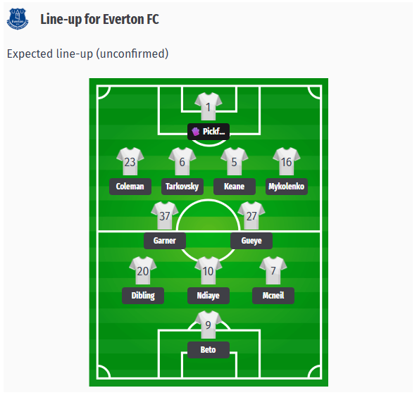 Ο David Moyes αναμένεται να αγωνιστεί με σχηματισμό 4-2-3-1: Pickford στο τέρμα, στην τετράδα της άμυνας ο Coleman ως δεξιός οπισθοφύλακας, οι Tarkowski και Keane ως κεντρικοί αμυντικοί και ο Mykolenko ως αριστερός οπισθοφύλακας. Το δίδυμο των μέσων αποτελείται από τους Garner και Gueye. Στο επιθετικό κέντρο θα αγωνιστεί μια τριάδα με τους Dibling, Ndiaye και McNeil, ενώ ο Beto θα καταλάβει τη θέση του κεντρικού επιθετικού. Τρεις παίκτες θα απουσιάσουν λόγω τραυματισμού: ο κεντρικός αμυντικός James Branthwaite με τραυματισμό στο μηρό και αγοραία αξία περίπου 50 εκατομμυρίων ευρώ, καθώς και ο δεξιός αμυντικός Patterson και ο μέσος Röhl. Για τους τρεις δεν έχει καθοριστεί ακόμη η ημερομηνία επιστροφής τους. Ως εναλλακτικές επιλογές από τον πάγκο θα μπορούσαν να μπουν στο παιχνίδι οι O’Brien, Dewsbury-Hall και Barry, τους οποίους ο Moyes θα μπορούσε να χρησιμοποιήσει κατά τη διάρκεια του αγώνα, αν χρειαστεί.