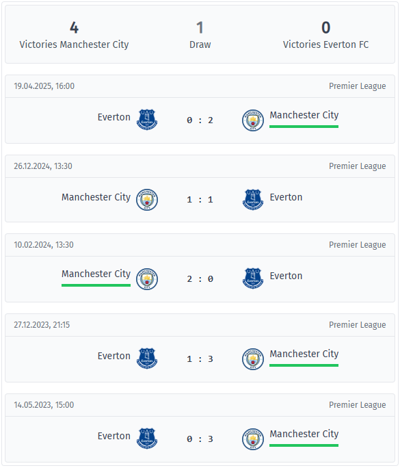 Το ιστορικό μεταξύ Μάντσεστερ Σίτι και Έβερτον είναι σαφώς υπέρ των Skyblues. Η Σίτι είναι αήττητη σε 16 αγώνες πρωταθλήματος εναντίον της Έβερτον, μια εντυπωσιακή σειρά που υπογραμμίζει την κυριαρχία της σε αυτό το ντέρμπι. Στις τελευταίες πέντε αναμετρήσεις, η Σίτι κέρδισε τέσσερις φορές, ενώ η Έβερτον κατάφερε να αποσπάσει μόνο μία ισοπαλία. Αυτή η ιστορική υπεροχή ενισχύει ακόμη περισσότερο το ρόλο της Σίτι ως φαβορί και καθιστά στατιστικά απίθανη μια εκτός έδρας νίκη των Toffees.
