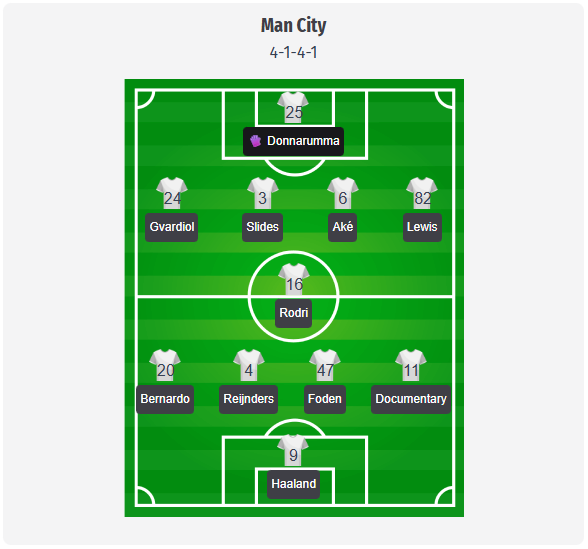 Η Σίτι αναμένεται να αγωνιστεί με το γνωστό 4-1-4-1, όπως είχε προβλεφθεί, με τον Ντονναρούμα πίσω από μια τετράδα με τους Λιούις, Ντίας, Ακέ και Γκβάρντιολ. Ο Rodri θα πρέπει να παίξει ως μοναδικός έξι μπροστά από την άμυνα, ο Silva και ο Reijnders θα τραβούν τα νήματα ως δύο οκτάρια, ο Foden θα μετακινηθεί από τα αριστερά προς τα μέσα και ο Doku θα φροντίσει για πλάτος στη δεξιά πλευρά. Ο Haaland θα ηγηθεί της επίθεσης και θα είναι ο κεντρικός παίκτης στην περιοχή. Ο Stones παραμένει εκτός λόγω προβλημάτων στο μηρό, ο Kovacic απουσιάζει με τραυματισμό στον αστράγαλο, ο Bobb έχει τραυματισμό στο μηρό και ο Marmoush δεν είναι διαθέσιμος λόγω διεθνών αγώνων, ενώ ο Savinho αναγκάστηκε να αντικατασταθεί λόγω τραυματισμού στο Sunderland και ο Aït Nouri βρίσκεται στο Κύπελλο Αφρικής. Ο Phillips είναι τιμωρημένος μόνο στην Ευρώπη. Αυτή η κατάσταση, σε συνδυασμό με την πιθανή μεταγραφή του Echeverri στη Χιρόνα, καθιστά την προβλεπόμενη αρχική ενδεκάδα πιθανή, αλλά σε καμία περίπτωση εγγυημένη.